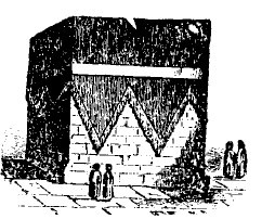chalk and mud which they used to build the Ka'bah. Here it is thought meritorious to pray. On the basis of the Ka'bah, just above the Mi'jan, is an ancient Kufic inscription, which neither Burckhardt nor Burton were able to decipher or to copy. On the north-west side of the Ka'bah, about two feet below its summit, is the water-spout, which is called the Mi'zabu' r-Rahmah, or the water-spout of mercy. The spout is of gold and was sent hither from Constantinople in A.H. 981. It carries rain from the roof, and discharges it upon Ishmael's grave. There are two large green marble slabs, which are said to have been presents from Cairo, A.H. 241, which are supposed to mark the graves of Hagar and Ishmael. The pavement round the Ka'bah consists of a very handsome mosaic of various colored stones, and is said to have been laid down A.H. 826. On one side of the Ka'bah is a semicircular wall, the extremities of which are in a line with the sides of the Ka'bah, and distant about six feet leaving an opening which leads to the grave of Ishmael. The wall is called al-Hatim, "the broken," and the enclosed area al Hijr, "the enclosure." The Ka'bah is covered with a coarse tissue of mixed silk and cotton, being of a brilliant black color, and with a gold band round it, upon which is inscribed the ninetieth verse of the third chapter of the Qur'an: "Verily the first home founded for mankind was surely that at Bakkah, for a blessing and guidance to mankind." The inscription being in large Kufic characters. For a further account of this cover, see KISWAH.