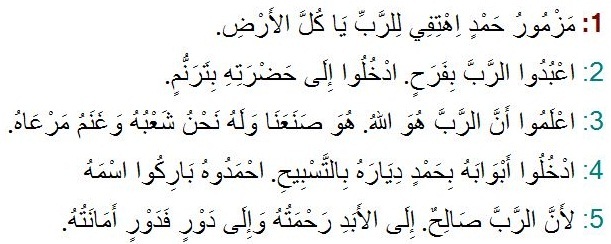 குர்-ஆனின் முதல் அத்தியாயம் “அல்-ஃபாத்தியா” கீழே அரபியில் கொடுக்கப்பட்டுள்ளது (7 வசனங்கள்). அதே போல, சங்கீதம் 100ஐ அரபியில்  கொடுத்துள்ளேன். நாம் இதுவரை படித்த அ, ம, ந, மற்றும் ய என்ற எழுத்துக்களையும், அவைகளின் இதர வடிவங்களையும் அடையாளம் காணுங்கள்.